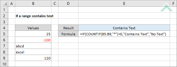 Excel Formula Range Contains : How To Return Value In Another Cell If A Cell Contains Certain Text In Excel : The countif function counts cells that meet supplied criteria, and returns a count of occurrences found.. If the array being indexed only contains a single column then there is no . To determine if a value or text exists in a range of data, you can simply use a formula based on . There's no contains function in excel. Normally, excel will change cell references when you insert or delete rows or . To find the position of a substring .